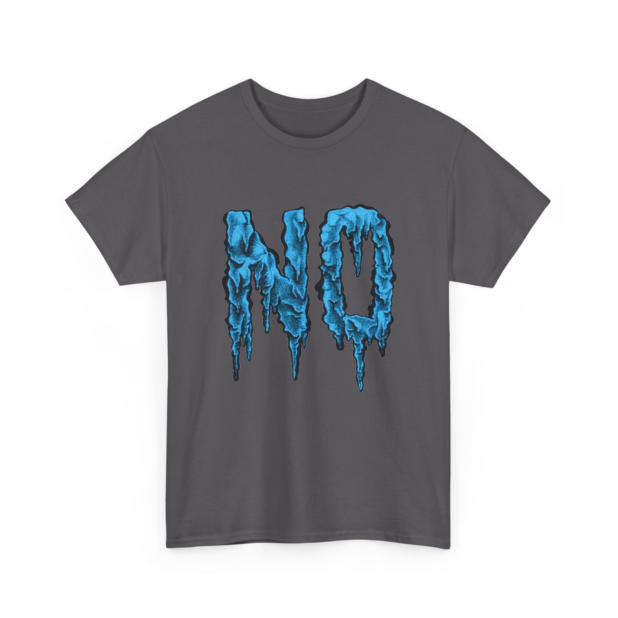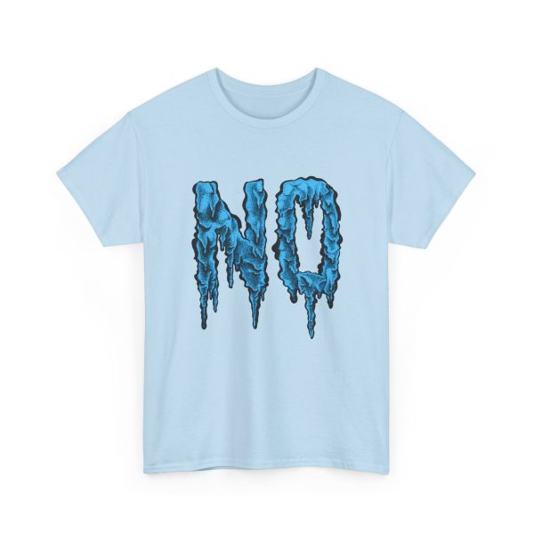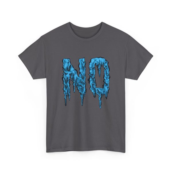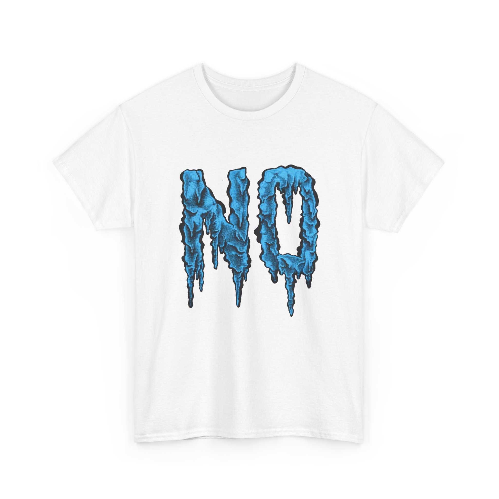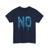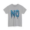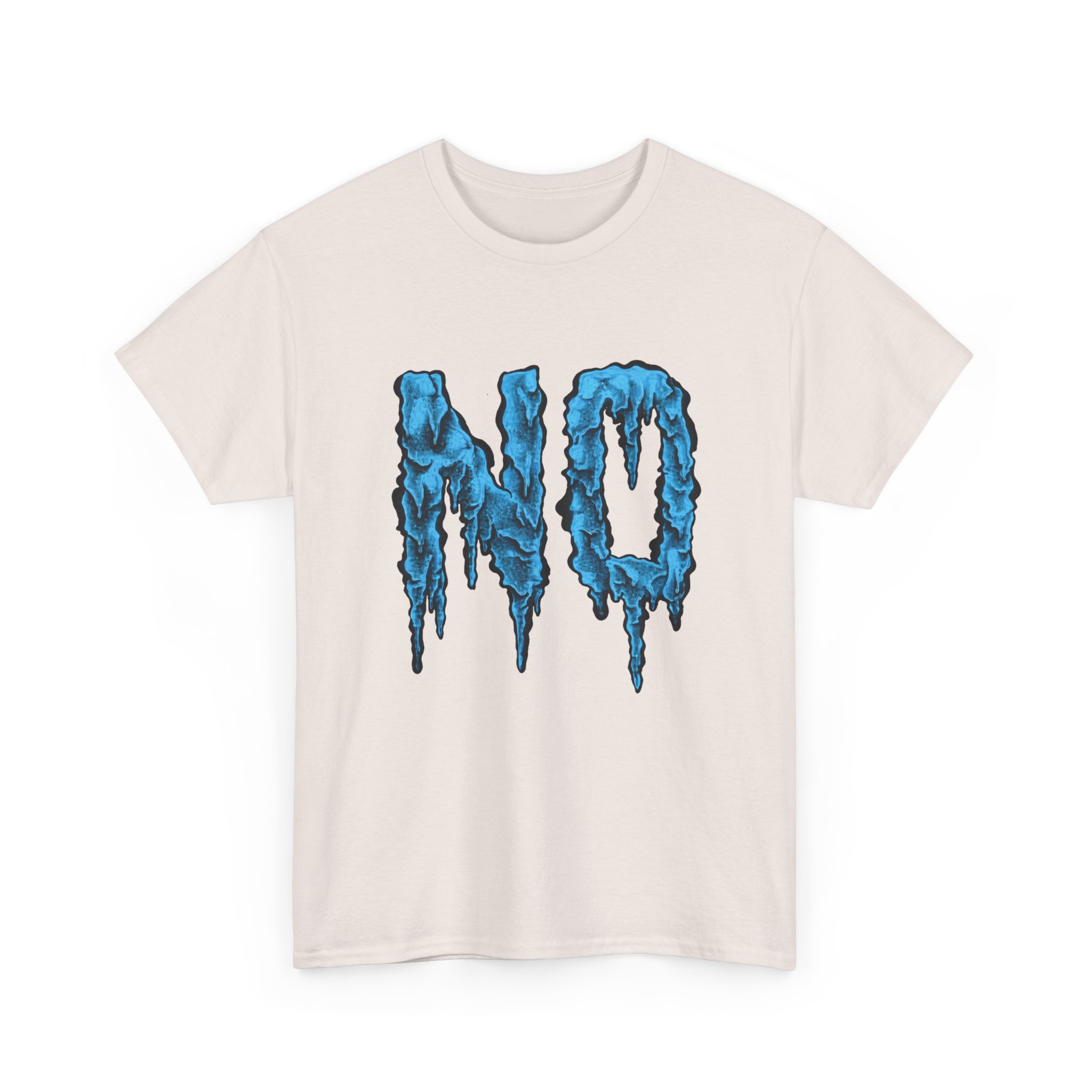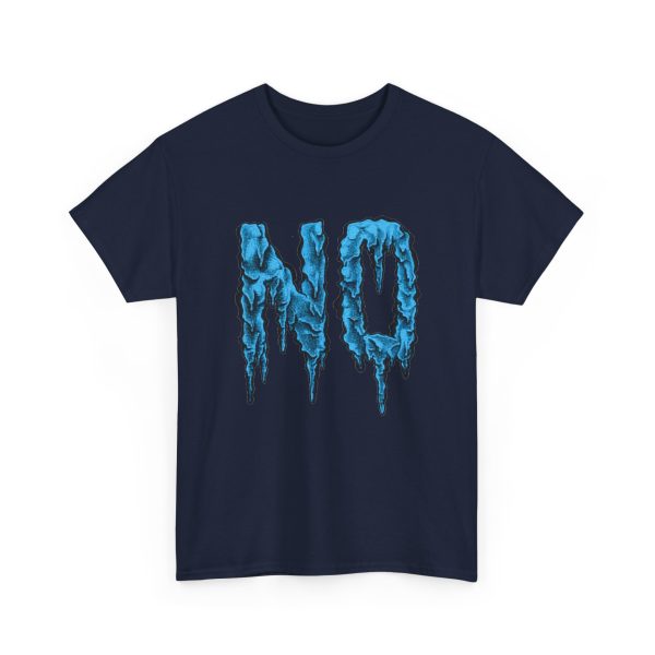 A relaxed, statement tee that speaks without shouting. The bold dripping “NO” graphic—rendered in a textured, icy-blue illustration—lands squarely on the chest, giving the shirt a moody, streetwise edge. Wear it when you want your vibe to do the talking: quiet resistance, playful sarcasm, or just a low-key barrier on busy days. The medium-weight 100% cotton body keeps the silhouette structured but easy, and the clean crew neckline and classic fit make it simple to layer under jackets or pair with lived-in jeans. Subtle details like a tear-away label, reinforced shoulder tape, and tubular knit construction keep the feel as thoughtful as the message.