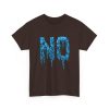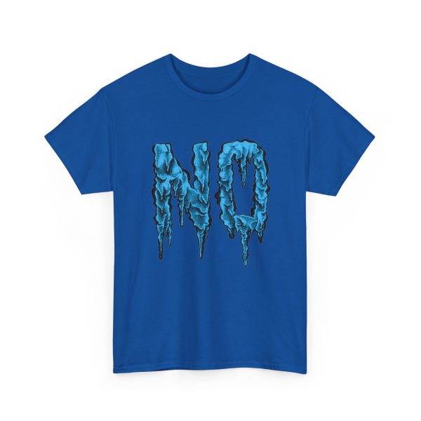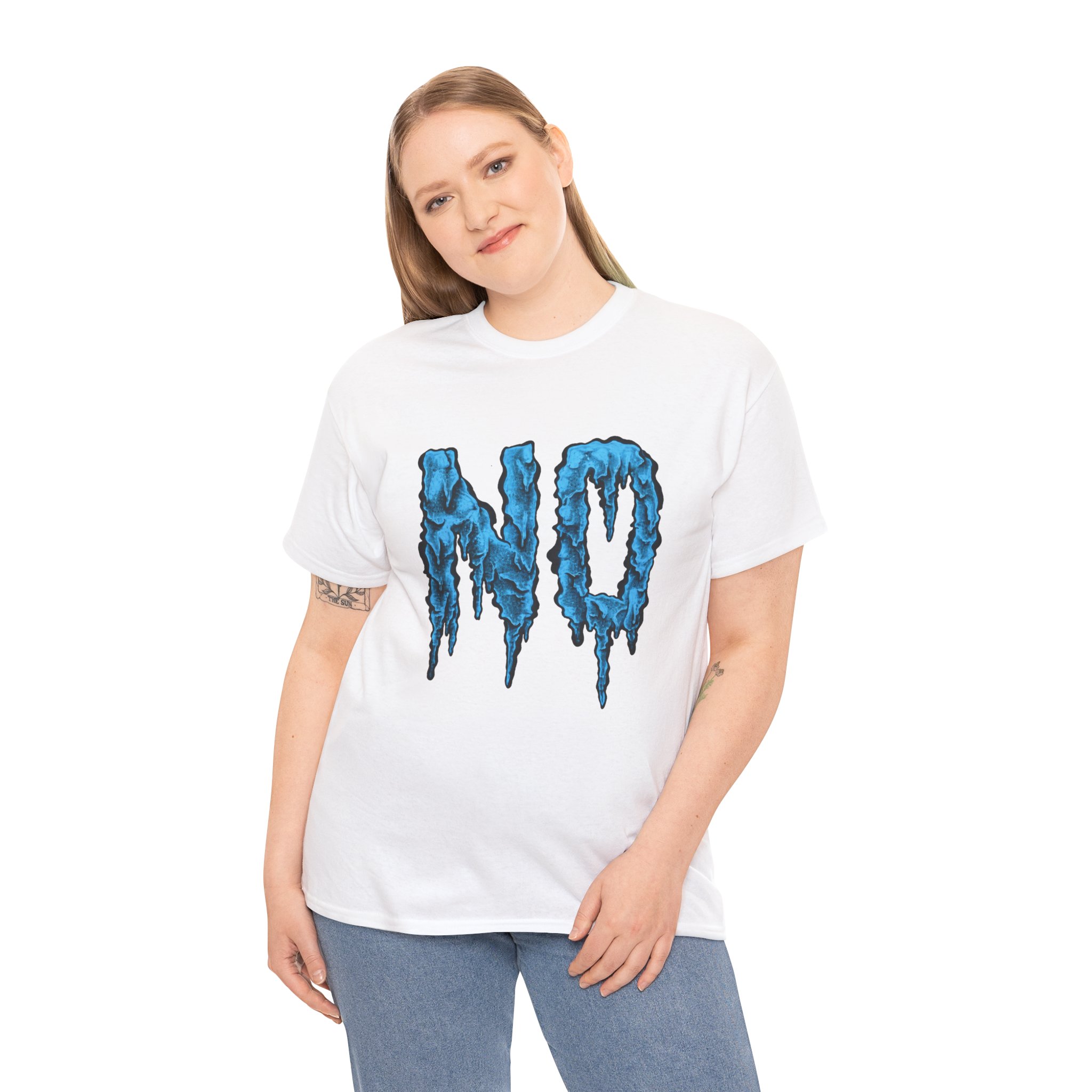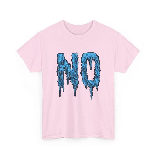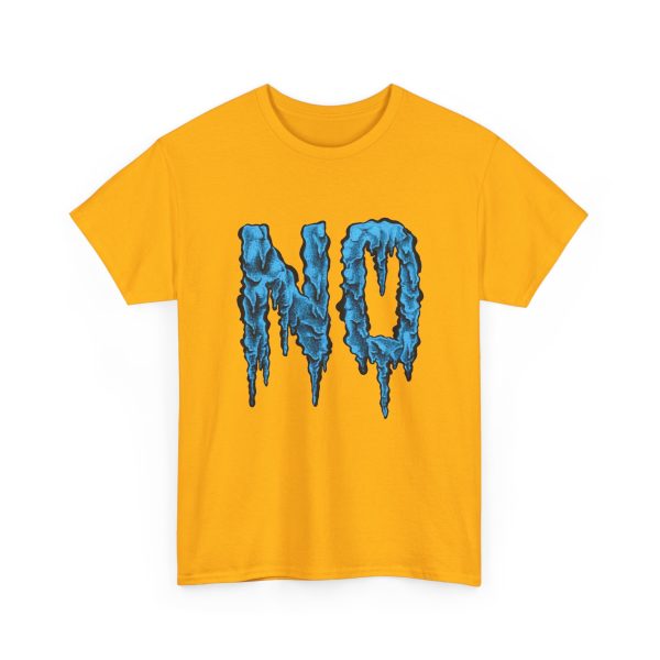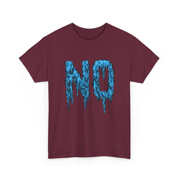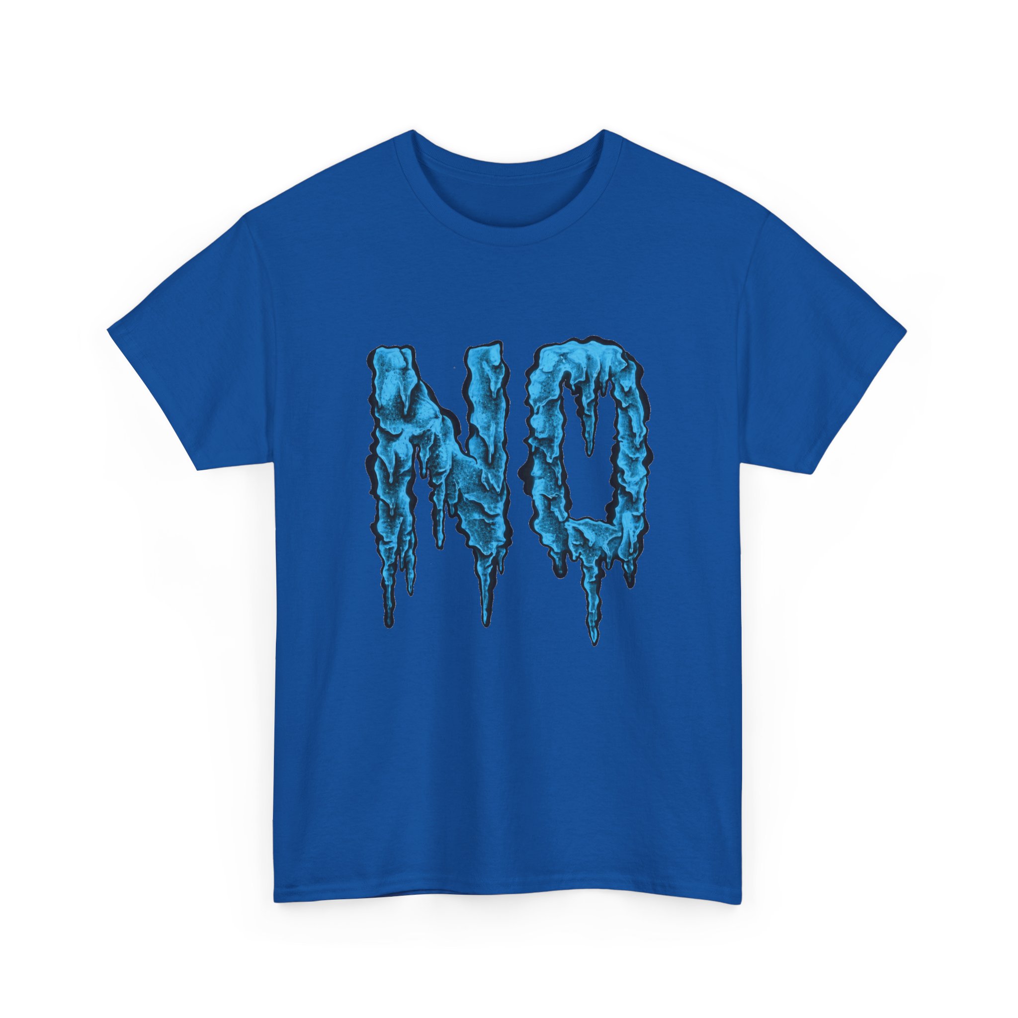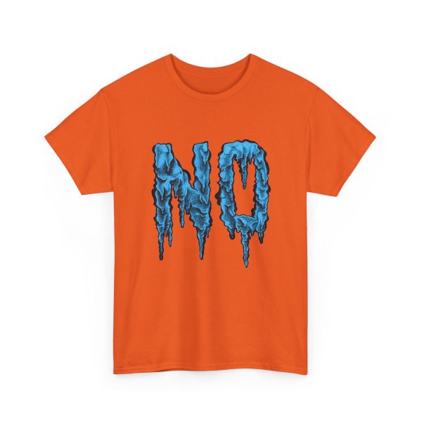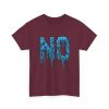A relaxed, statement tee that speaks without shouting. The bold dripping “NO” graphic—rendered in a textured, icy-blue illustration—lands squarely on the chest, giving the shirt a moody, streetwise edge. Wear it when you want your vibe to do the talking: quiet resistance, playful sarcasm, or just a low-key barrier on busy days. The medium-weight 100% cotton body keeps the silhouette structured but easy, and the clean crew neckline and classic fit make it simple to layer under jackets or pair with lived-in jeans. Subtle details like a tear-away label, reinforced shoulder tape, and tubular knit construction keep the feel as thoughtful as the message.