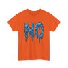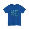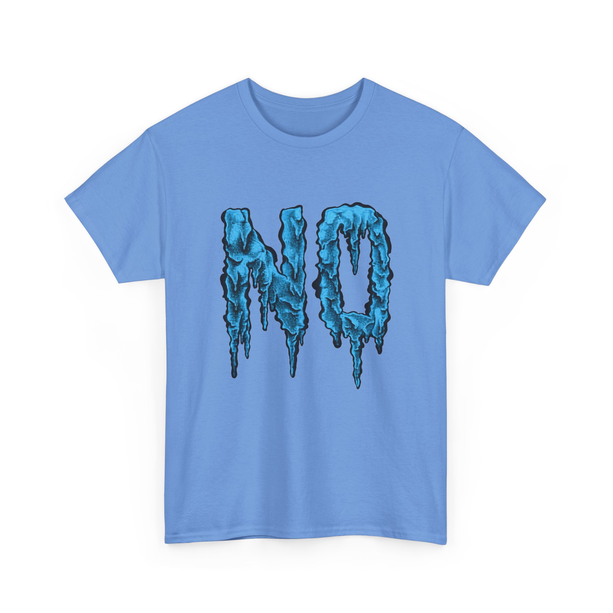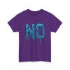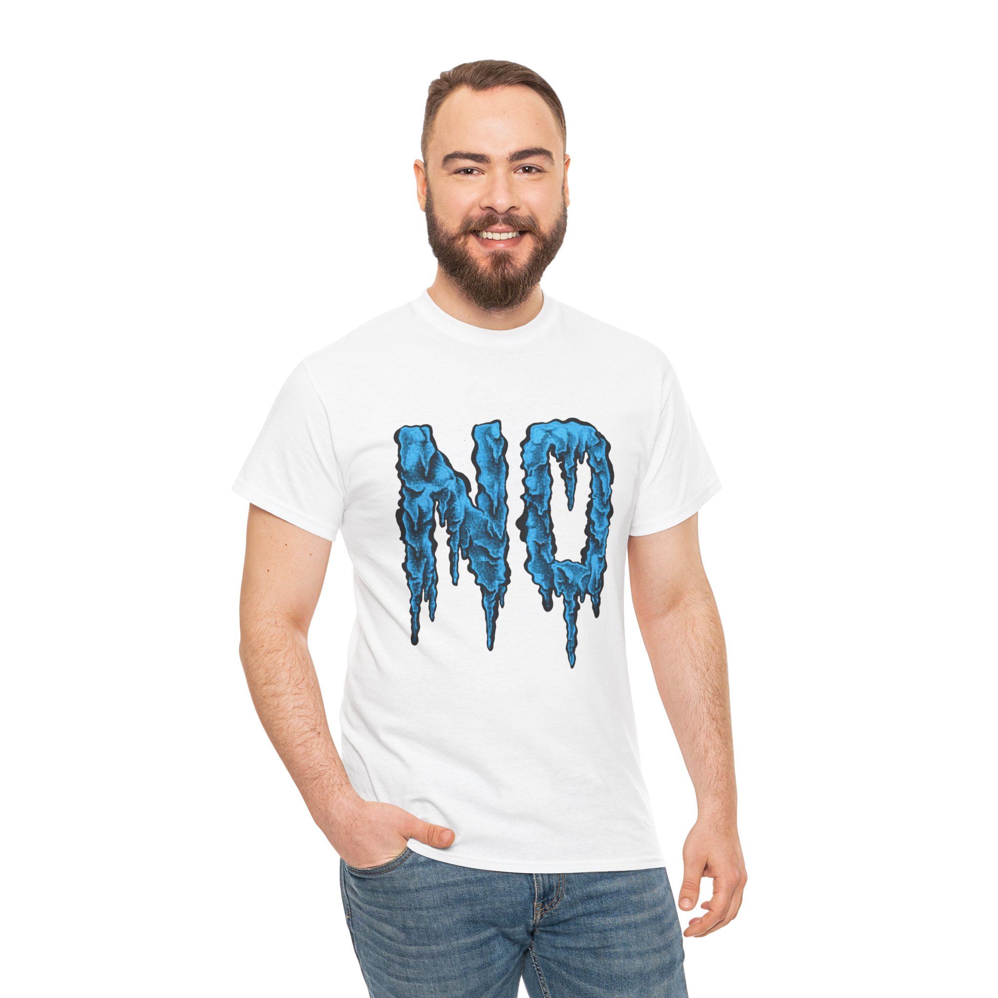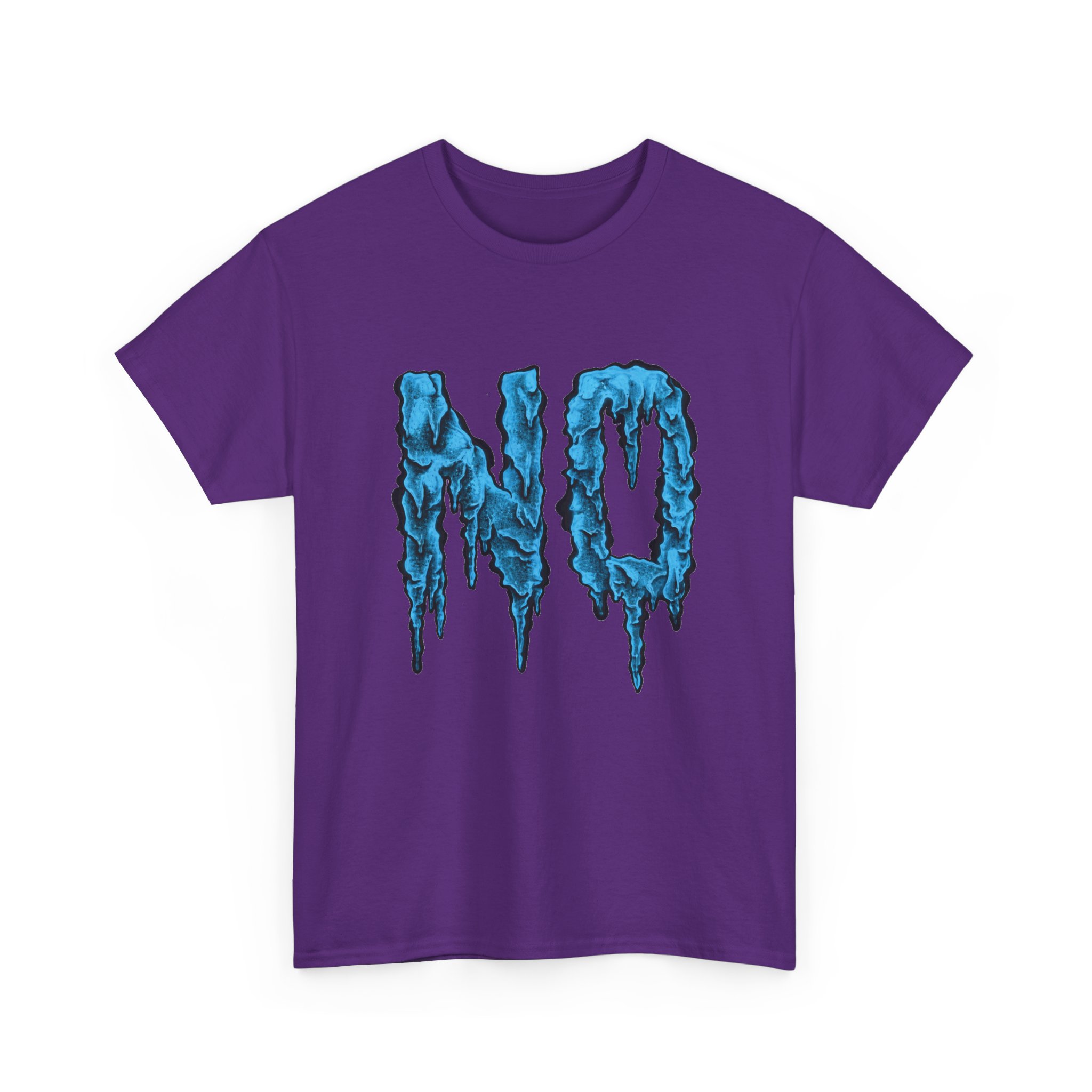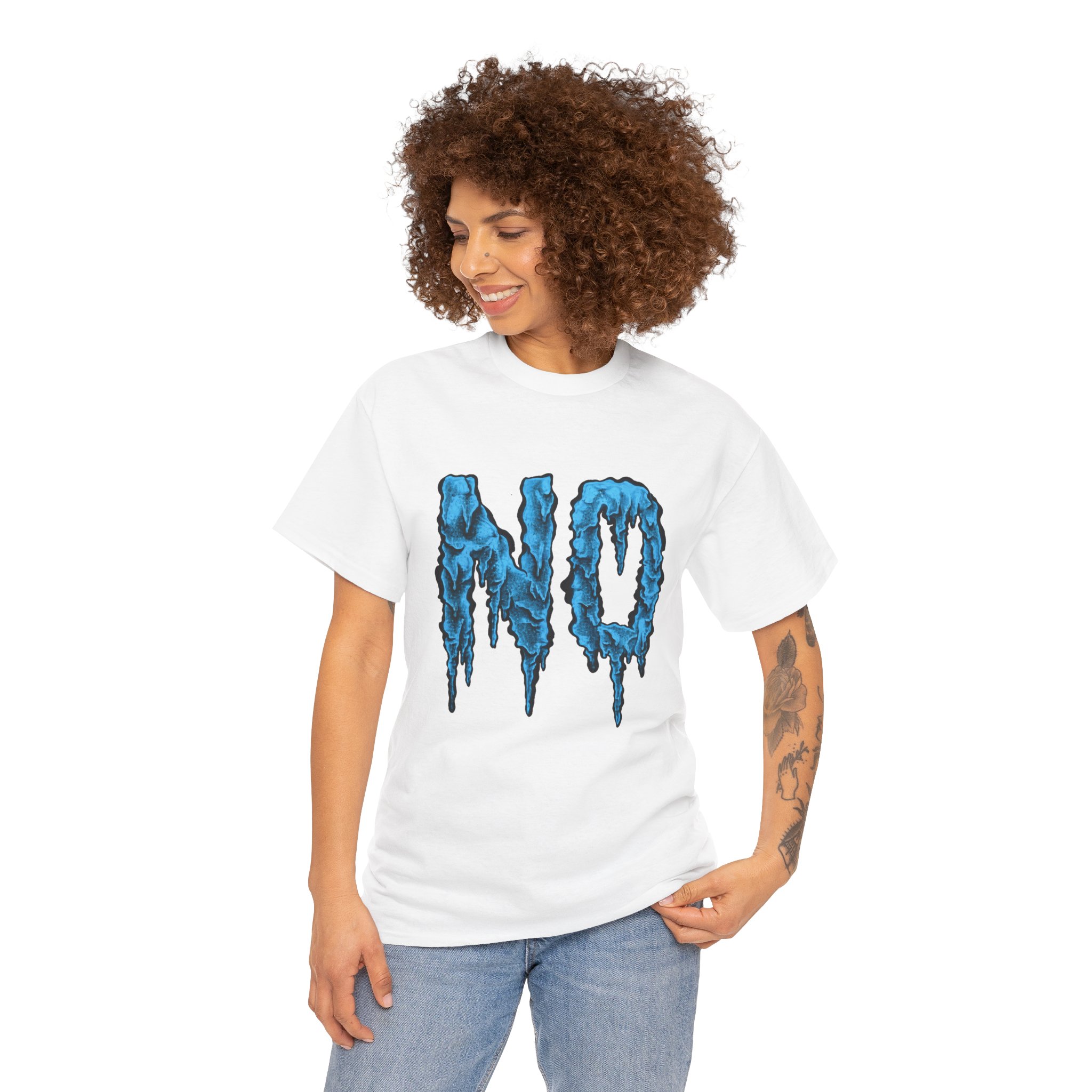 A relaxed, statement tee that speaks without shouting. The bold dripping “NO” graphic—rendered in a textured, icy-blue illustration—lands squarely on the chest, giving the shirt a moody, streetwise edge. Wear it when you want your vibe to do the talking: quiet resistance, playful sarcasm, or just a low-key barrier on busy days. The medium-weight 100% cotton body keeps the silhouette structured but easy, and the clean crew neckline and classic fit make it simple to layer under jackets or pair with lived-in jeans. Subtle details like a tear-away label, reinforced shoulder tape, and tubular knit construction keep the feel as thoughtful as the message.