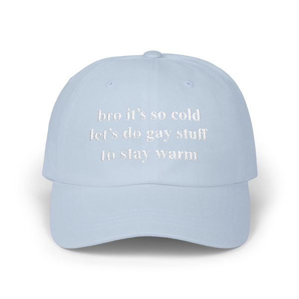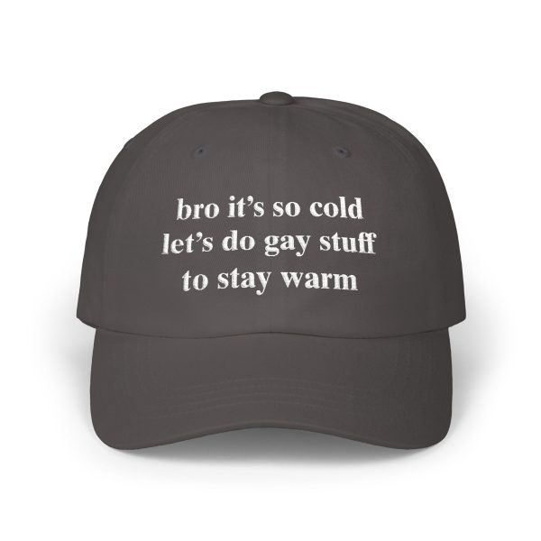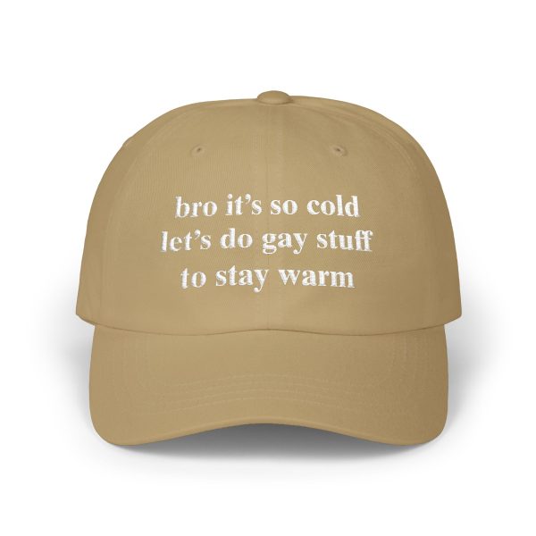 A soft, Bro It’s So Cold Let’s Do Gay Stuff To Stay Warm Hat that reads like a cozy whisper: “brr it’s so cold let’s do cozy stuff to stay warm.” Lightweight cotton and a low-profile, unstructured fit let this hat sit naturally on your head—no stiffness, just comfort. The precurved Permacurv® visor and matching underbill keep the silhouette classic while the antique-brass hideaway strap gives it a quiet vintage edge. Wear it on brisk mornings while grabbing coffee, layering up for a city stroll, or throwing on after a chilly morning run. The neutral tone and subtle embroidered text blend with knit scarves, oversized sweaters, and worn-in denim, creating an easy, everyday look that feels personal and familiar.