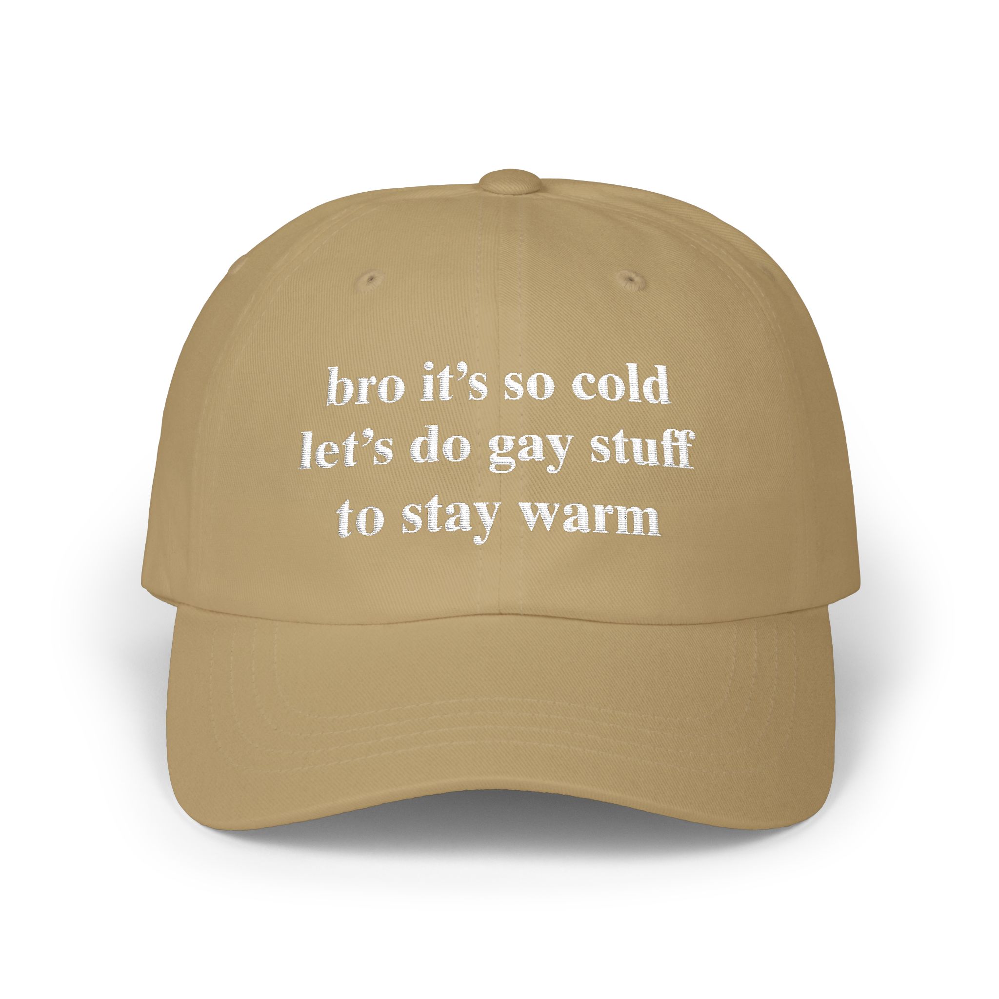 A soft, Bro It’s So Cold Let’s Do Gay Stuff To Stay Warm Hat that reads like a cozy whisper: “brr it’s so cold let’s do cozy stuff to stay warm.” Lightweight cotton and a low-profile, unstructured fit let this hat sit naturally on your head—no stiffness, just comfort. The precurved Permacurv® visor and matching underbill keep the silhouette classic while the antique-brass hideaway strap gives it a quiet vintage edge. Wear it on brisk mornings while grabbing coffee, layering up for a city stroll, or throwing on after a chilly morning run. The neutral tone and subtle embroidered text blend with knit scarves, oversized sweaters, and worn-in denim, creating an easy, everyday look that feels personal and familiar.
