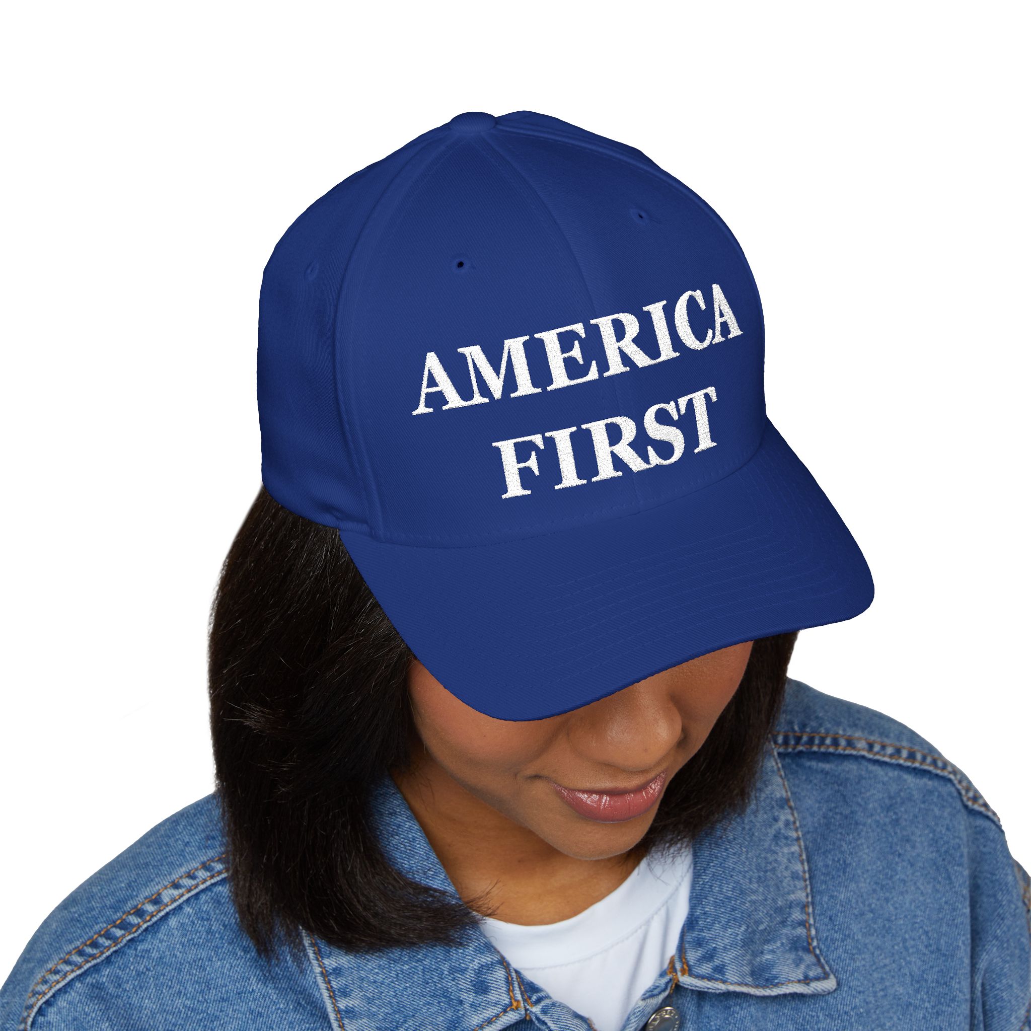 A clean, structured cap with bold embroidered lettering that reads across the front in a textured stitch. The Nick Fuentes America First Hat build holds its shape while the curved visor and silver undervisor add subtle contrast. A stretchy inner band offers a snug, comfortable fit for most head sizes. Wear it to make a clear statement without fuss — minimal lines, strong presence, and easy everyday wear.