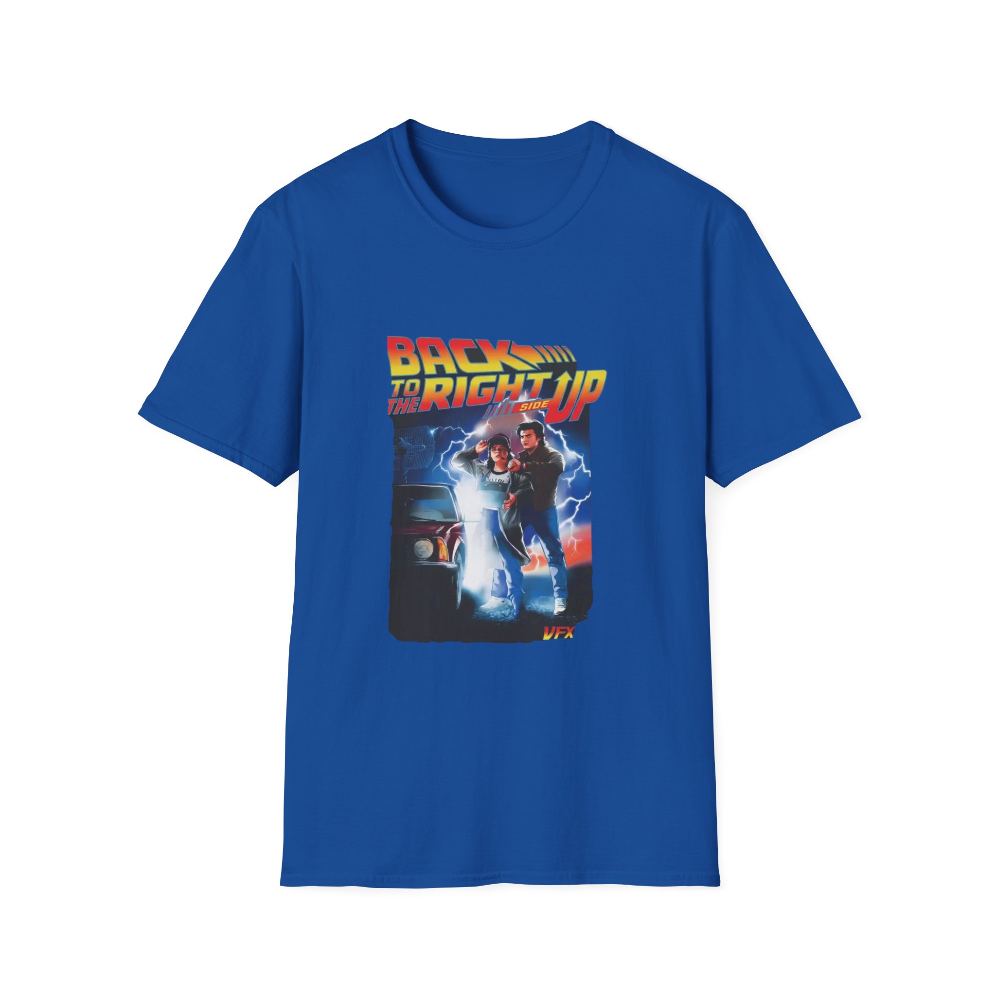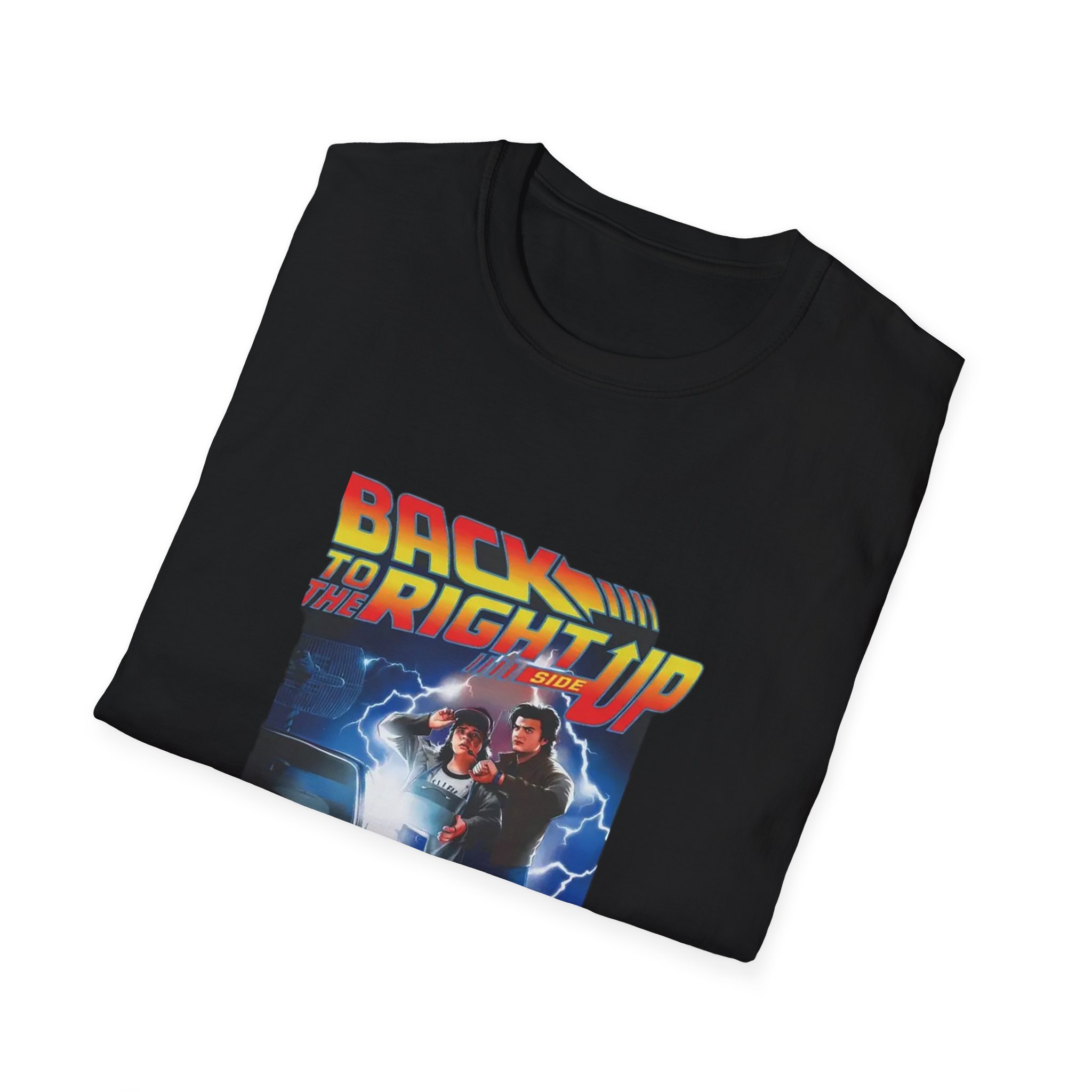 Step into a neon-charged throwback. This Stranger Things Back To The Future Right Side Up Shirt carries a cinematic 80s-inspired graphic — a time-traveling duo, electric sparks, and a retro type treatment that reads like an action poster. It sits comfortably on the chest without overpowering the silhouette, letting the imagery do the talking while the clean black fabric keeps the look grounded. Wear it for late-night drives, record-store hunts, or when you want a little cinematic energy with your everyday outfit. The result feels lived-in, nostalgic, and ready for whatever scene you’re walking into.