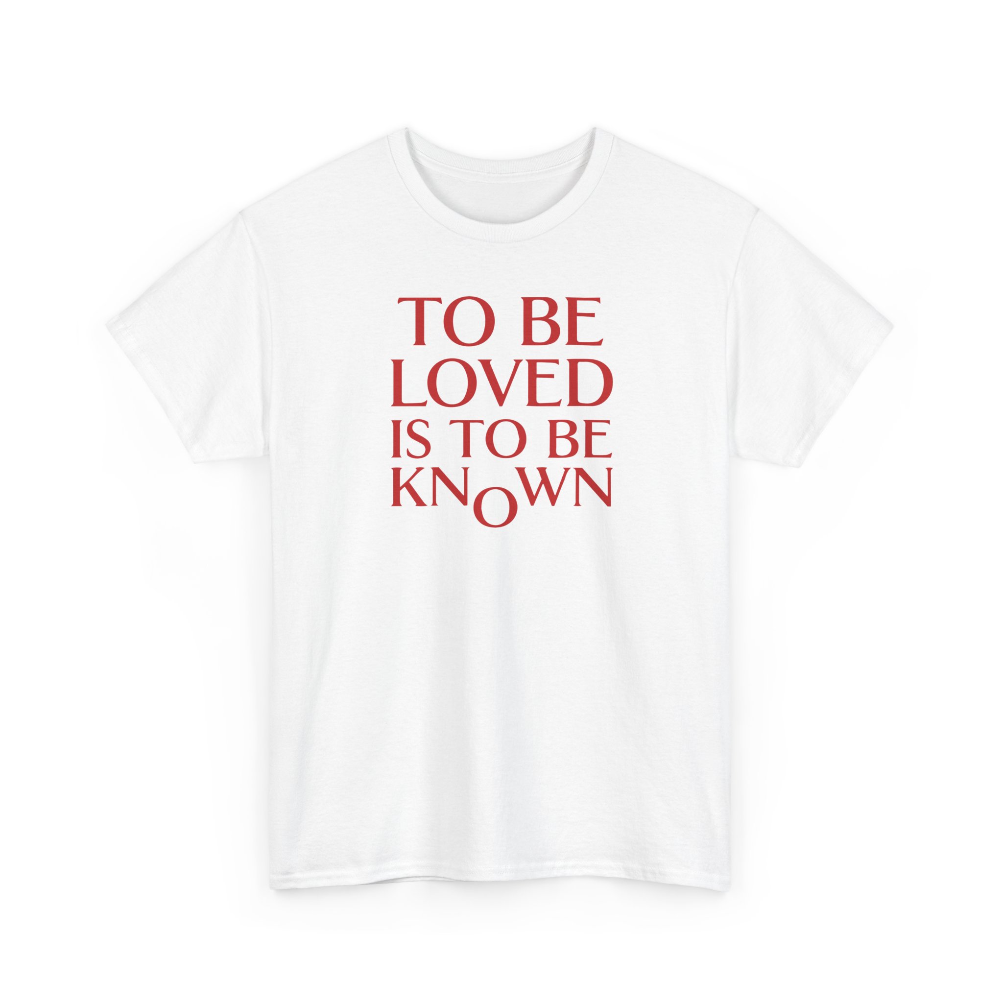 Soft, honest, and quietly bold — this classic crew tee carries a simple declaration: TO BE LOVED IS TO BE KNOWN. The clean serif lettering sits centered on a crisp white field, giving the message room to breathe. Wear it on slow mornings with coffee, layered under a cardigan for long conversations, or out walking the city when you want what you say to do the talking. The fit is relaxed without feeling sloppy, and the breathable cotton settles easily against the skin so the sentiment — and the person wearing it — stay comfortable all day.