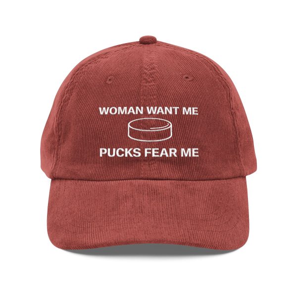 Woman Want Me Pucks Fear Me Hat -Funny Hockey Meme Cap for Players and Fans